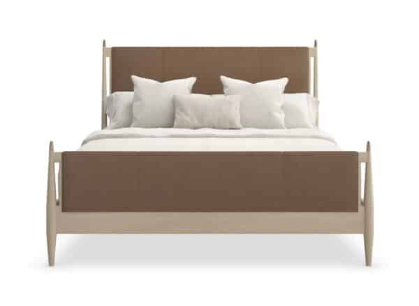With flowing modern lines and a rich use of material, the Rhythm king bed brings a simple yet sophisticated cadence to bedroom interiors. Tailored in a lavish, camel-colored leather, its clean, parsons-style headboard warmly complements a Sun Drenched Oak wood frame. Metal finials in a Lucent Bronze finish accentuate subtly tapered posts with a note of luxe. Rhythm queen bed also available.
