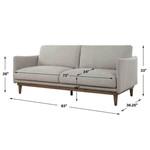 Relax in the sink-in comfort of the Freefall sofa. Featuring clean modern lines and resting on a solid oak base in walnut with gray ceruse. High density foam cushions are dacron wrapped and upholstered in a warm toasty beige polyester boucle.