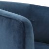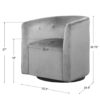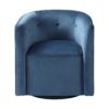 Make a dramatic statement with this barrel style swivel chair, covered in an ink blue polyester velvet with button tufted accents. Rests on a satin black wood base. Seat height is 19″.