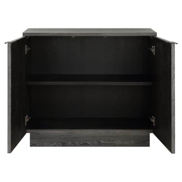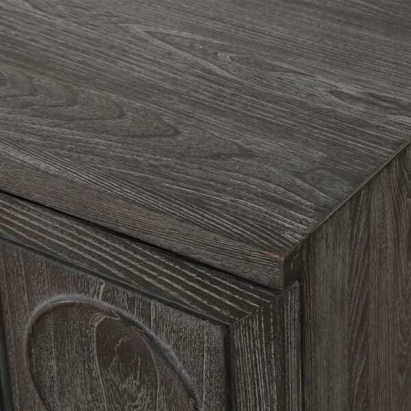 A two door cabinet featuring a striking carved circular design, constructed from solid elm and elm veneer. The rich ebony stain highlights the dramatic wood grain. Two complementing solid iron door pulls make for stylish and effortless functionality. Has one interior adjustable shelf.