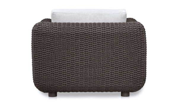 The Soma outdoor accent chair finds a graceful interplay of form and purpose. Its dark brown finished PE synthetic wicker frame and sunproof, heathered Olefin fabric cushions exude poise and durability. Curved, playful arms and quick-dry foam invite relaxation while ensuring timeless panache.